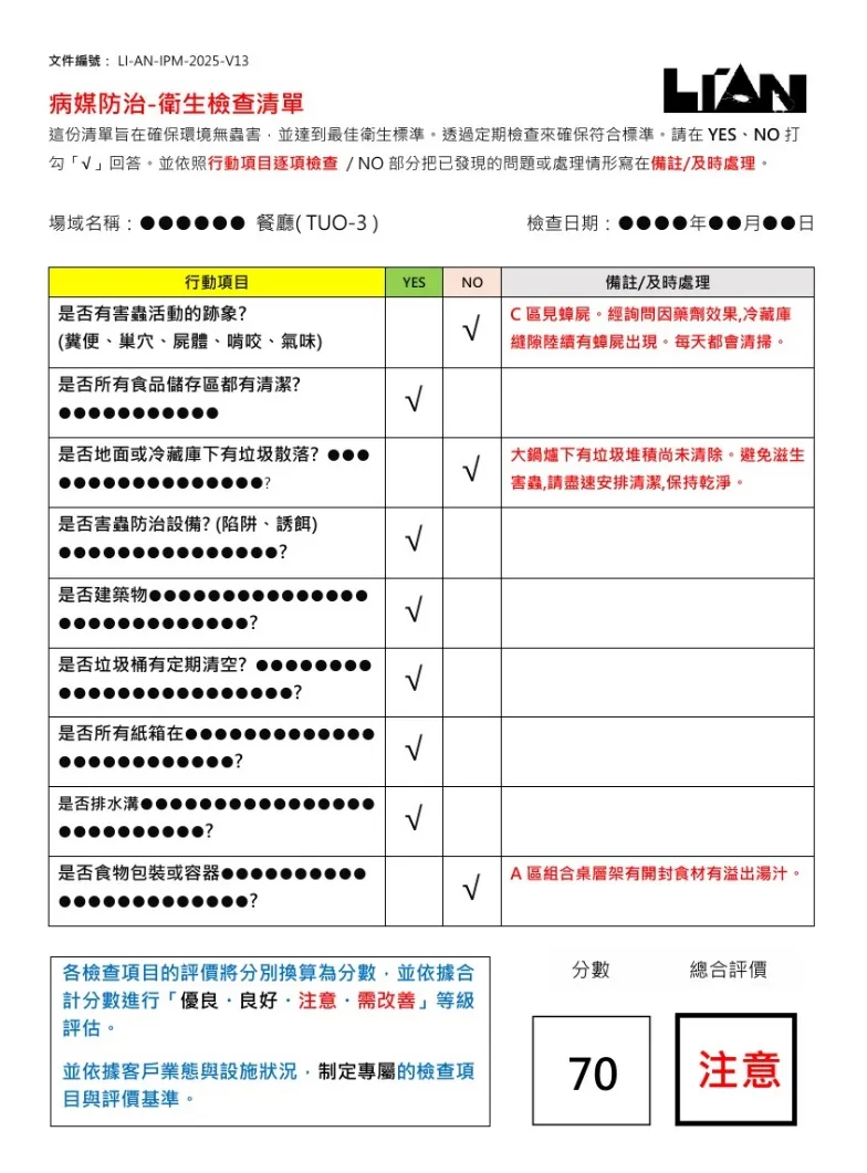 衛生檢查表並非採用標準化的制式表單,評估客戶的業務類型與設施特性進行客製化設計。它定義所需的檢查區域及管理重點項目,避免遺漏重要環節,是執行衛生管理作業的最佳紀錄工具。